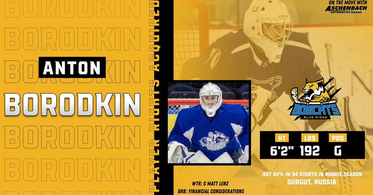 The Blue Ridge Bobcats, proud members of the FPHL, have announced the acquisition of goaltender Anton Borodkin and financial considerations from the Watertown Wolves in exchange for the rights to goalie Matt Lenz .